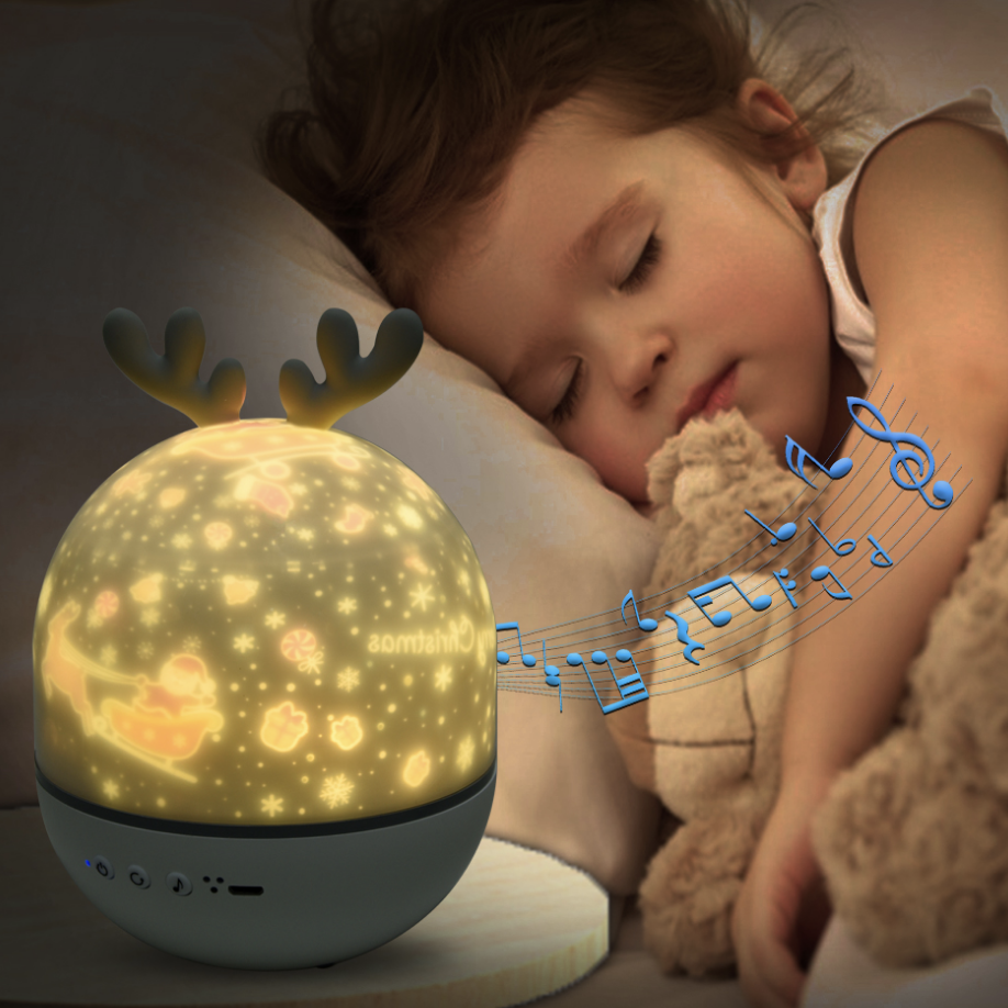 Découvrez la veilleuse musicale cerf avec son projecteur, le complément parfait pour apaiser ou amuser. Avec son haut-parleur bluetooth intégré, son projecteur d’étoiles et d’autres univers, il fera briller les yeux de votre enfant et sera sans doutes le compagnon préféré à ne jamais oublier !