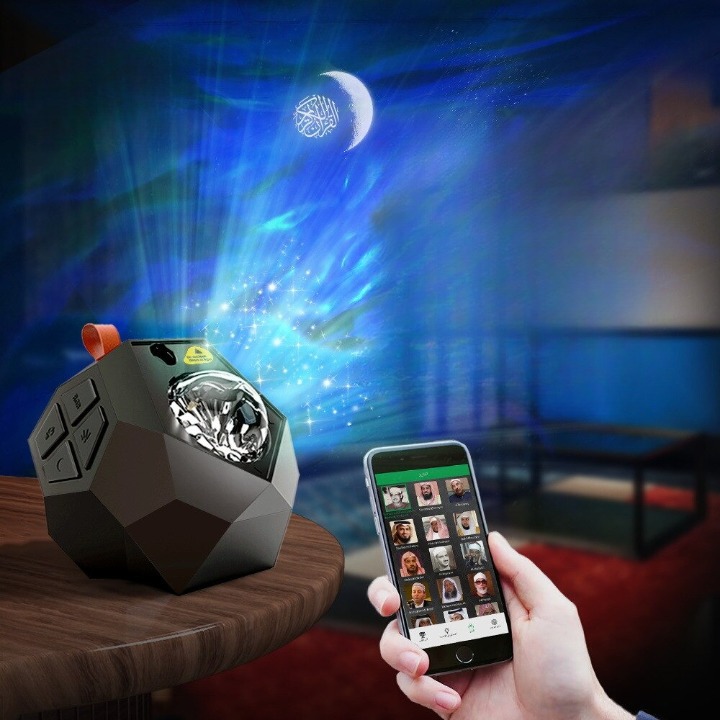 Notre veilleuse coranique à projection vous offre un spectacle totalement hors du commun accompagné de vos récits sacrés préféré. Disposant de deux modes différent : océan ou galaxie, choisissez la projection que vous préférez accompagner de son morceau de lune et texte du coran.