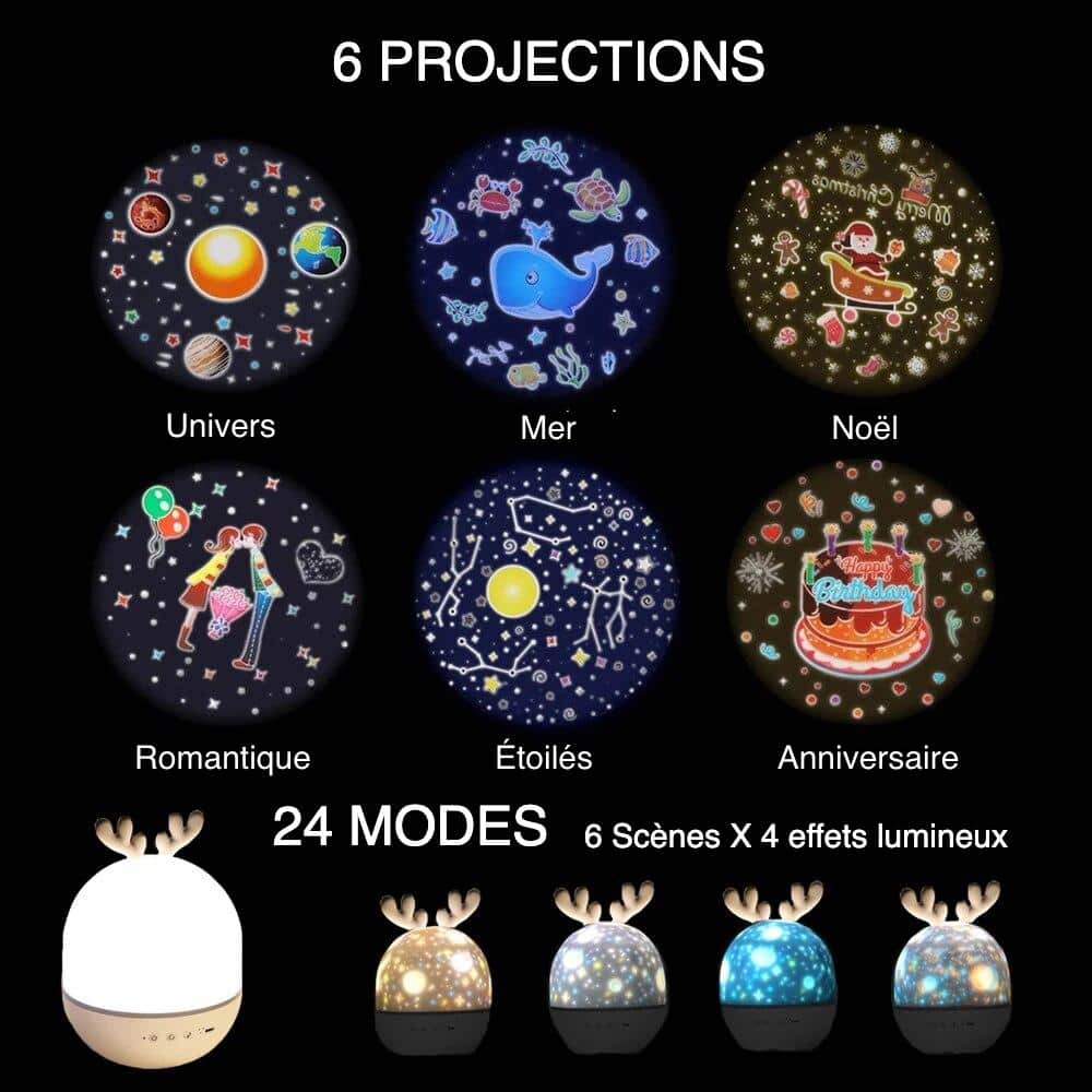 Non seulement cette veilleuse pour bébé projette des effets lumineux au plafond en mouvement à 360°, mais elle dispose de 6 types de projections différentes ainsi que 4 effets de lumières différentes, ce qui vous laisse donc le choix entre 24 types d’effets au total ! De quoi ravir votre bébé et le et combler de bonheur lors du coucher…